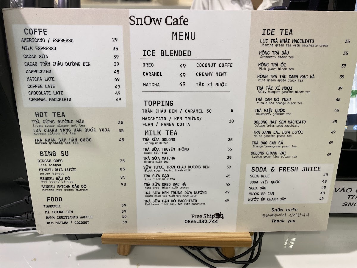 The menu at SnOw cafe Dĩ an primarily features a selection of coffee and tea beverages, catering to various tastes with options such as espresso-based drinks and milk teas. Alongside drinks, the menu includes light food items like cheese pizza and desserts including Korean-style Bingsu. There are also specialty soda options available, such as strawberry and green apple sodas.